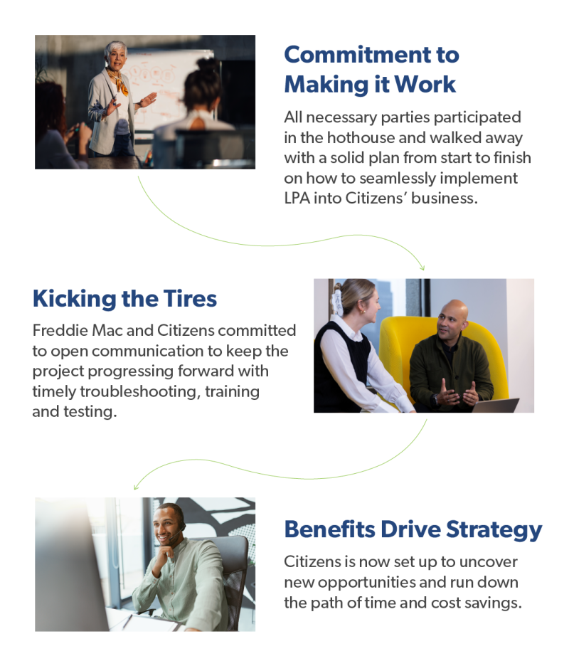 After this exercise, Freddie Mac account executives set up reoccurring meetings with the project teams from Citizens and their LOS provider to keep the project moving forward and answer any questions or concerns in a timely manner. Outside of the meetings, lines of communication were kept open across all parties, encouraging transparency in the implementation journey. On the Freddie Mac side, technical integration managers with deep knowledge about LPA functionality and integration were also included during discussions to conduct demos and troubleshoot. These practices helped Citizens adhere to and streamline their project timeline.