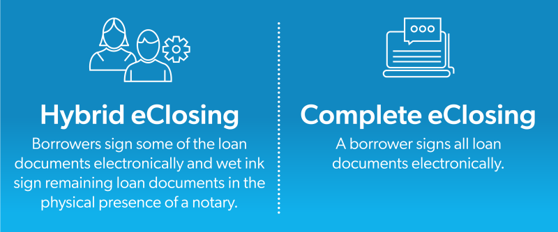 - Hybrid eClosing—borrowers sign some of the loan documents electronically and wet ink sign any remaining loan documents in the physical presence of a notary.
