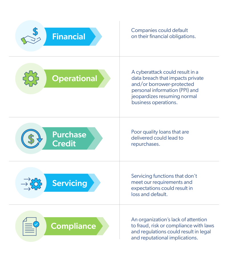 Counterparty relationships are symbiotic ones, which must be carefully curated and continuously monitored. When a Seller/Servicer requires services provided by a vendor or company, any issues or concerns at that organization could have a material adverse impact on the Seller/Servicer and on our ability to meet our mission.