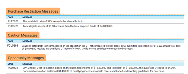 - The Opportunity Messages section will include messages delivered on Accept or Caution risk class loans – helping you identify situations where rent payment history or positive cash flow could benefit the borrower and LPA Choice messages to help you get to Accept and more.