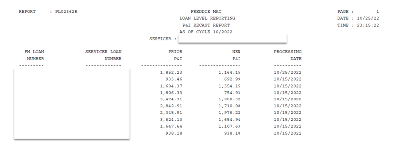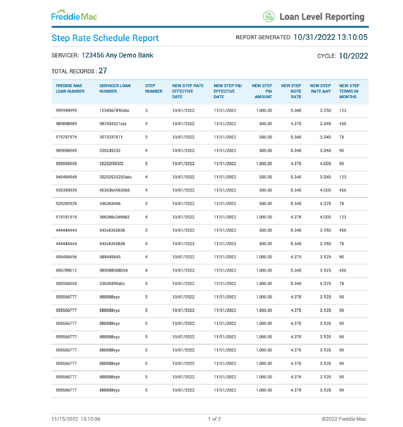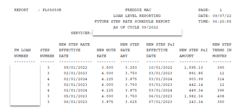 What’s Different: The existing Step Rate Notification Report and Future Step Rate Schedule Report contain similar data. To eliminate redundancy and consolidate information, the two reports have been merged into a single report called Step Rate Schedule Report. An enhancement updates the order of the columns to be more logical and user-friendly, and the Servicer Loan Number column has been added. Finally, the Freddie Mac Loan Number now appears in every row to allow downloads to be sorted accordingly.