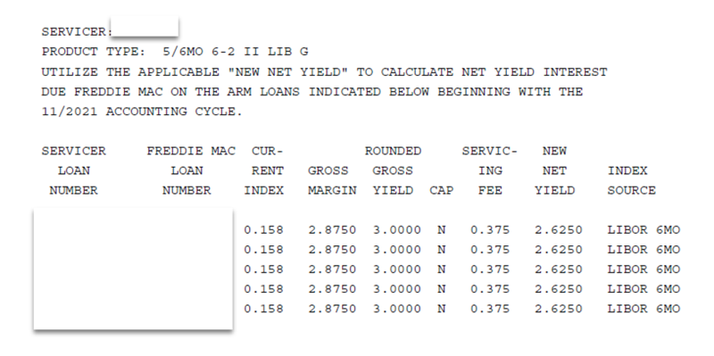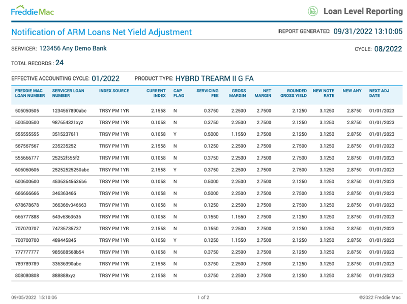 What It Is: A monthly report available 45 days prior to the scheduled payment change date of an adjustable-rate mortgage (ARM) loan. It identifies loans that have net yield rates that are scheduled to adjust.