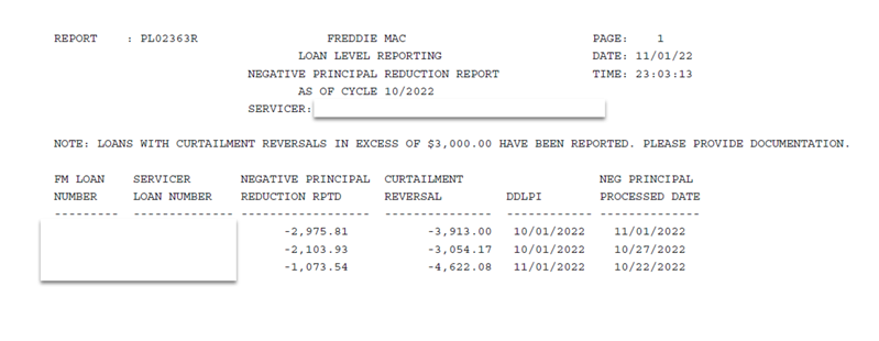 What It Is: A cumulative view of loans that had a curtailment reversal or negative principal reduction amount in the accounting cycle greater than the allowable threshold of $3,000.