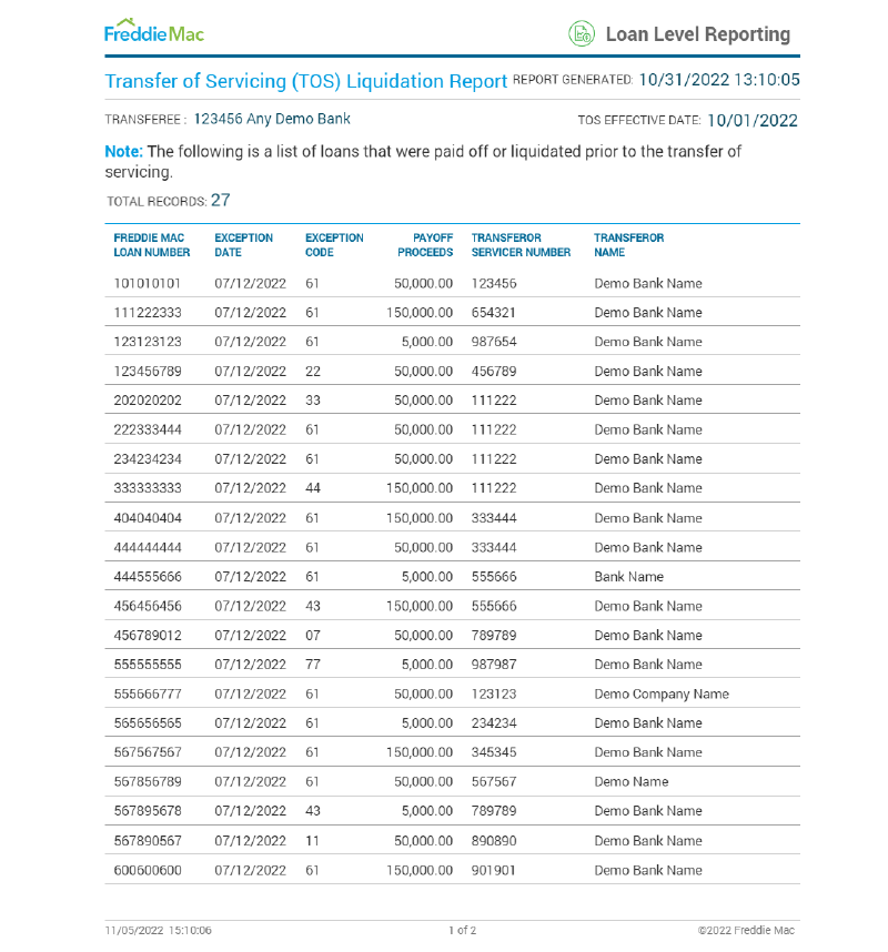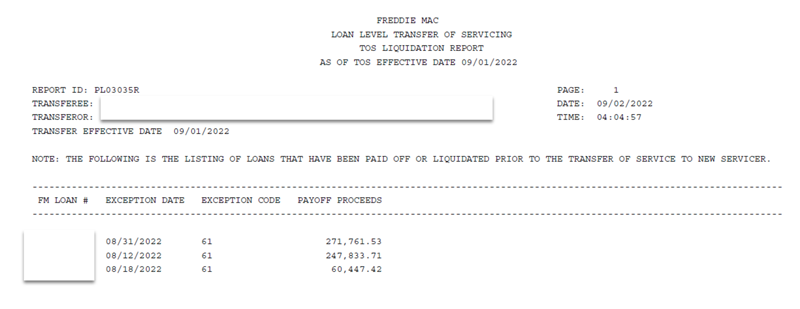 What It Is: A cumulative view of all loans within the transfer population that were liquidated the month prior to the transfer of servicing (TOS) effective date.